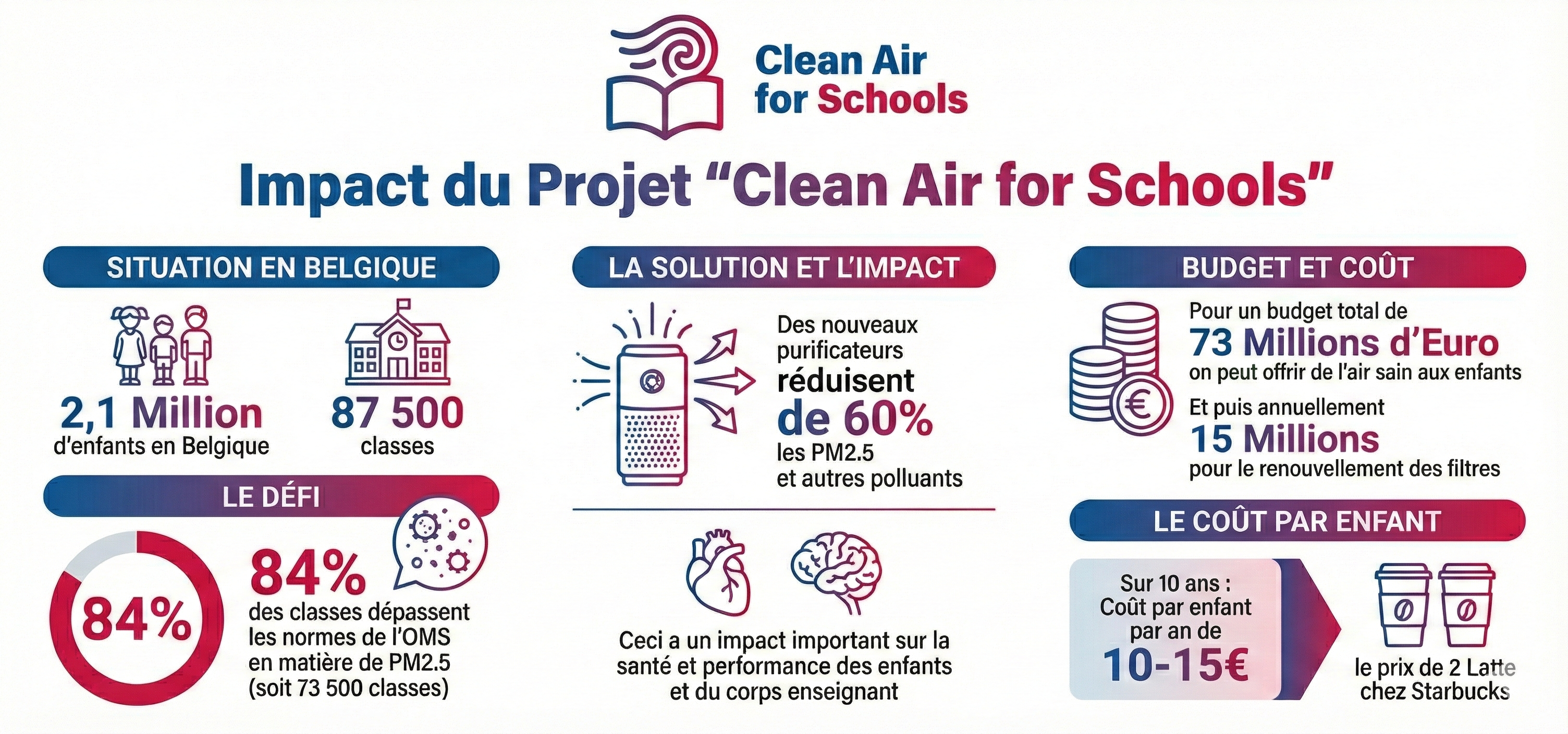 Le projet Clean Air for Schools, avec le soutien de Belfius, démontre qu’une solution simple et abordable peut améliorer rapidement et significativement la qualité de l’air dans les salles de classe. « Pour les décideurs politiques, cela devrait être une évidence : investir dans un air sain, c’est investir dans la santé des générations futures », insiste Antoine Geerinckx. « La solution est efficace, abordable et améliore immédiatement l’environnement d’apprentissage. Elle offre aussi aux entreprises et aux organisations une occasion concrète d’investir dans leur communauté. À cet égard, nous appelons les entreprises, les organisations et les responsables politiques à unir leurs efforts pour améliorer la qualité de l’air dans les salles de classe. »