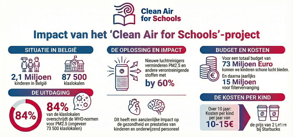 Bruxelles, 25 février 2026 – Près de 9 salles de classe belges sur 10 (84 %) dépassent les recommandations de l’Organisation mondiale de la Santé (OMS) en matière de particules fines (PM₂.₅). Ce chiffre alarmant ressort de trois années de mesures menées dans 75 écoles dans le cadre du projet Clean Air for Schools d’Airscan. Une exposition prolongée peut nuire aux poumons des enfants, à leur concentration et à leurs performances scolaires. À la suite de ces résultats inquiétants, le projet lance une deuxième phase avec des purificateurs d’air abordables, recommandés par le gouvernement, capables d’éliminer jusqu’à 60 % des particules fines présentes dans l’air des classes. Cette solution permet aussi aux écoles qui disposent d’un budget limité pour la ventilation d’offrir un environnement d’apprentissage plus sain. L’école GBS Windroos à Molenbeek-Saint-Jean est la première à être équipée de ces appareils. Avec le soutien d’entreprises locales, Clean Air for Schools entend équiper l’ensemble des écoles belges.