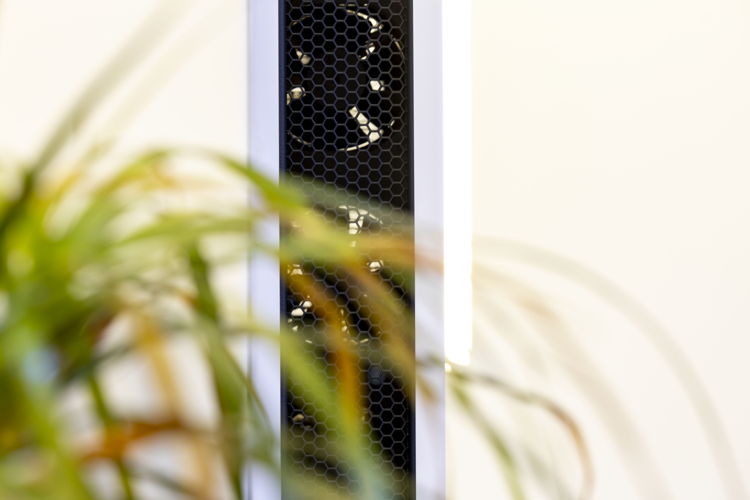 Avec une largeur d’à peine 41 cm, Vertilina Hybrid s’adapte parfaitement aux habitations dotées de grandes baies vitrées, de séjours compacts ou de surfaces murales limitées. L’orientation verticale libère l’espace et améliore la circulation dans la pièce. Le motif alvéolaire discret de la grille et la finition épurée en blanc ou noir créent une signature esthétique sobre et intemporelle qui s’intègre dans tous les styles d’intérieur.