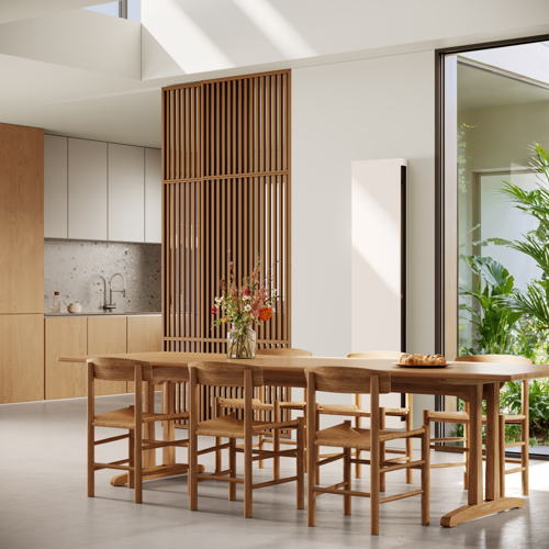 Le design vertical élancé de Vertilina Hybrid s’intègre parfaitement à côté des fenêtres, dans les cuisines ou les couloirs étroits. Il se fond discrètement dans l’espace tout en assurant un confort optimal. Sa ligne élégante, caractéristique de Jaga, apporte une sensation de sérénité, même dans les zones à surface murale limitée. Le radiateur est disponible en 11 hauteurs, en blanc, noir et gris sablé, ainsi que dans un large éventail de coloris design Jaga. La grille au motif alvéolaire subtil associe technologie et esthétique dans un ensemble intemporel.